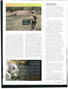 My name is Jared Schafer, I am 10 years old and I live in Southern California. I learned about Wolf Haven when a speaker came to the Environmental Nature Center in Newport Beach to tell us about wolves and Wolf Haven. She talked about wolves and the need for Wolf Haven to protect those wolves that can not be let back in the wild. She told us about specific wolves and how you could adopt one. I was so excited about it that I adopted a wolf named Caedus, a young black wolf. My family was planning a trip to Portland over the summer so we included Wolf Haven in our travel plans so that I could meet Caedus and check out Wolf Haven. Since we were planning on going to Wolf Haven in August I decided to raise some money to help support Caedus. For my 10th birthday I had my friends donate to my wolf fund instead of giving me a present. In August we visited Caedus and the other wolves and animals at Wolf Haven and I donated $200.00 to help support Caedus. I loved Wolf Haven and plan to go again in the future. You should go if you haven’t been there. It is a great place. – Jared Schafer (from the Spring issue of Wolf Haven)