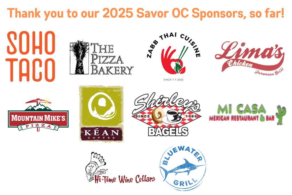 Local restaurants participating in the 2024 Savor OC showcase include SOHO Taco, Pizza Bakery, Mountain Mike’s, Mi Casa, Zabb Thai, Lima’s Peruvian Grill, Shirley’s Bagels & Kean Coffee!  Please support local restaurants that support their community! Learn more on our Savor OC page. Email us if you’re a restaurateur that would like to participate.
