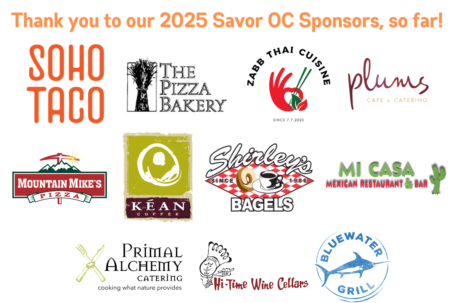 Local restaurants participating in the 2025 Savor OC showcase include Primal Alchemy Catering, SOHO Taco, Pizza Bakery, Mountain Mike’s, Mi Casa, Zabb Thai, Shirley’s Bagels & Kean Coffee! Please support local restaurants that support their community! Learn more on our Savor OC page. Email us if you’re a restaurateur that would like to participate.